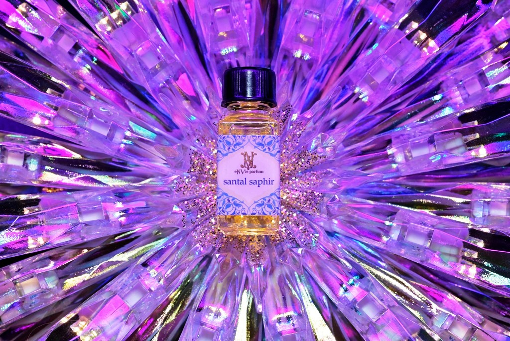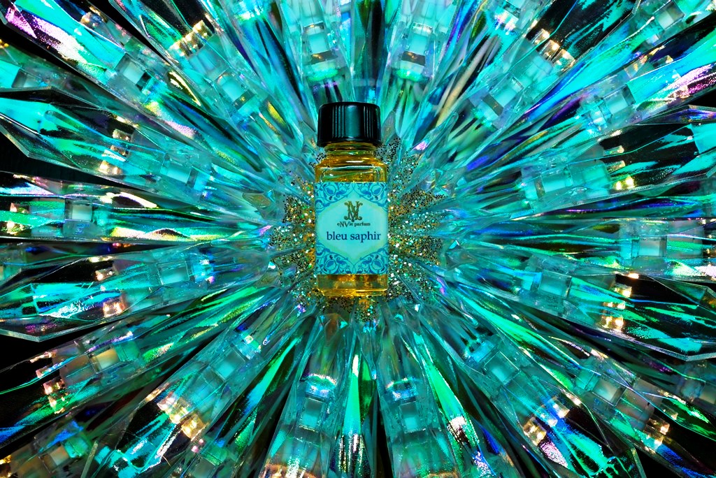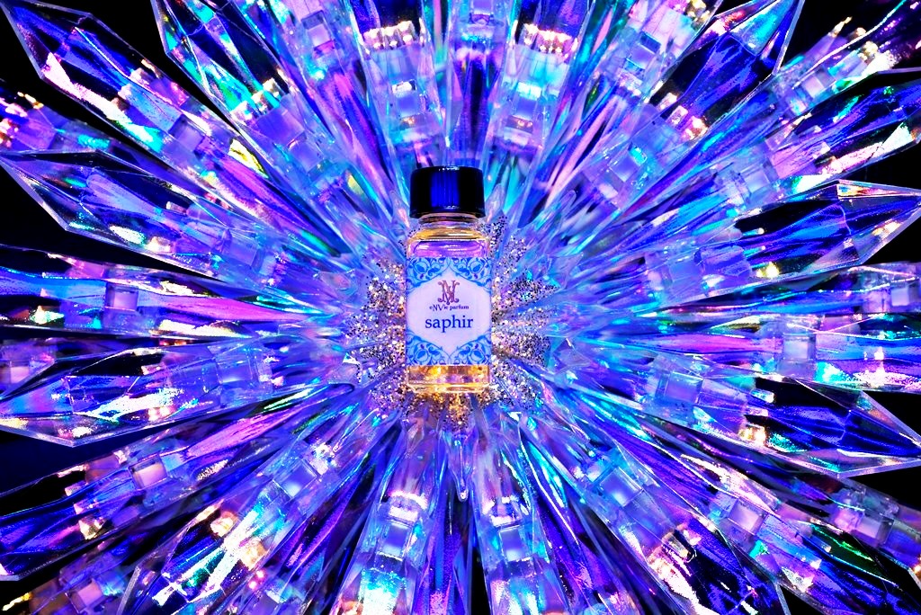 bleu saphir - Blue Chamomile Absolute, Labdanum, Siam Benzoin, Blue Sumian Lavender and Coral Wood, Blue Cypress, Blue Yarrow Absolute and Blue Tansy infused in Blue Amber and saphir (Egyptian Amber and Musk Resin, Sweet Papyrus of Cairo, Blue Balsamic Amber, Siam Benzoin, and pure Vanillin)