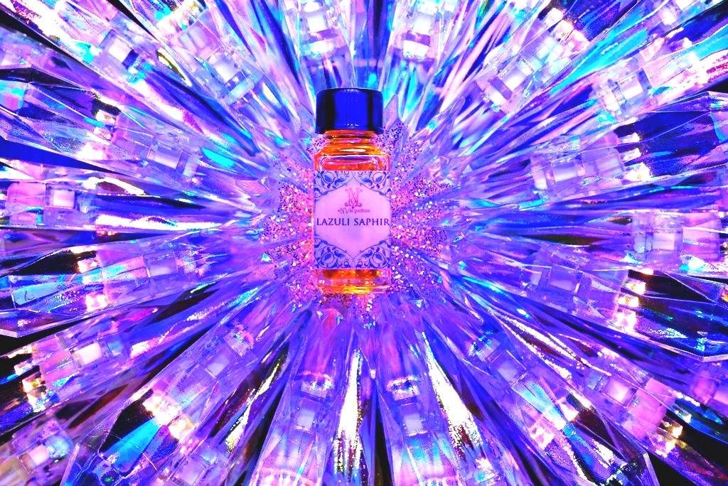 lazuli saphir - Indian Sal tree resin, Sal distillation, Smoked Pineapple skin, Blue Sugar accord, Balsam of Peru, Oud, Black Patchouli, Styrax Benzoin resin, Blue Lotus extract, Hungarian Labdanum absolute, Roman Blue Chamomile extract, Egyptian Amber and Musk Resin, Sweet Papyrus of Cairo, Blue Balsamic Amber, Siam Benzoin, and pure Vanillin