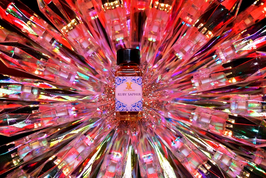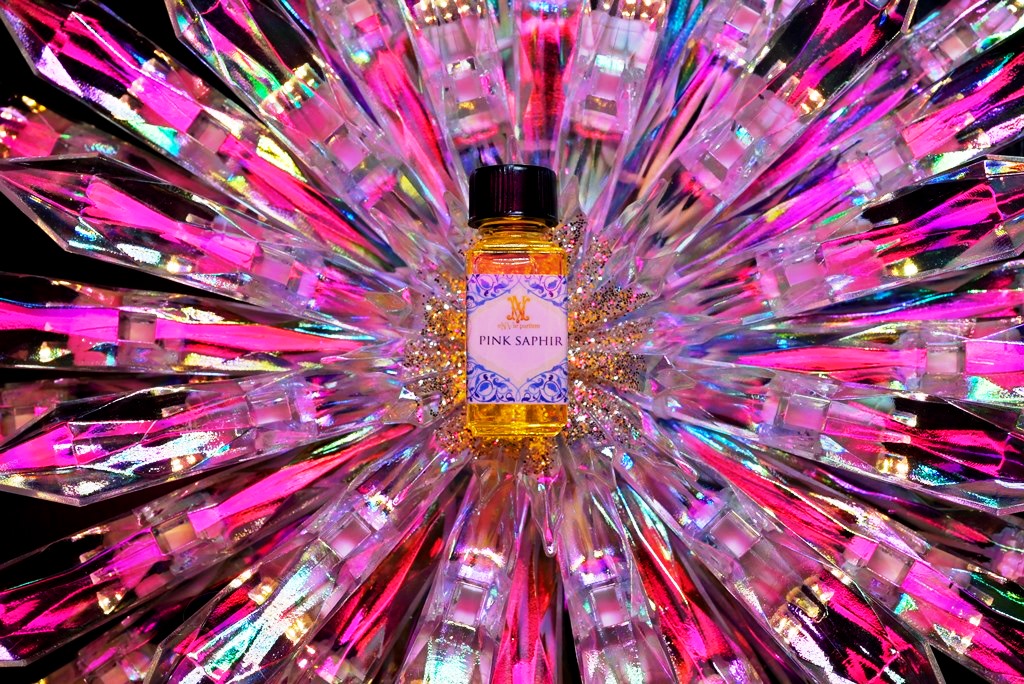 pink saphir - Hawaiian Pikake, Egyptian Pink Lotus absolute, Iris, Tuberose, Honeysuckle, Pink Sugar accord, Plumeria, Sandalwood, Rose, Vanilla Bean absolute,Egyptian Amber and Musk Resin, Sweet Papyrus of Cairo, Blue Balsamic Amber, Siam Benzoin, and pure Vanillin